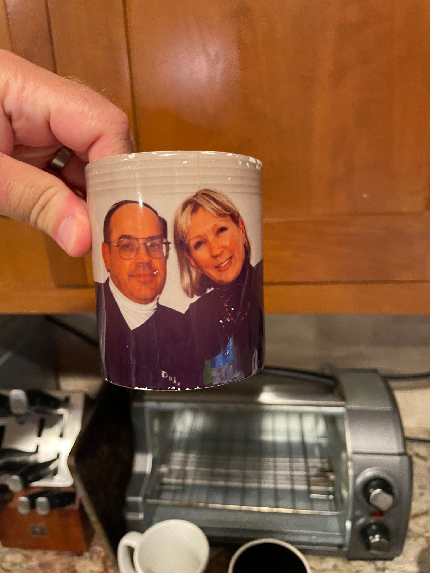 (17) This is a picture of my in-laws. They are lovely people, but I confess that drinking coffee out of a mug with their faces (from many years ago) sort of freaks me out. They don’t read this newsletter which means I’m comfortable publicly criticizing them (or at least their mug) in this way. This mug tends to live in the back of the cabinet.