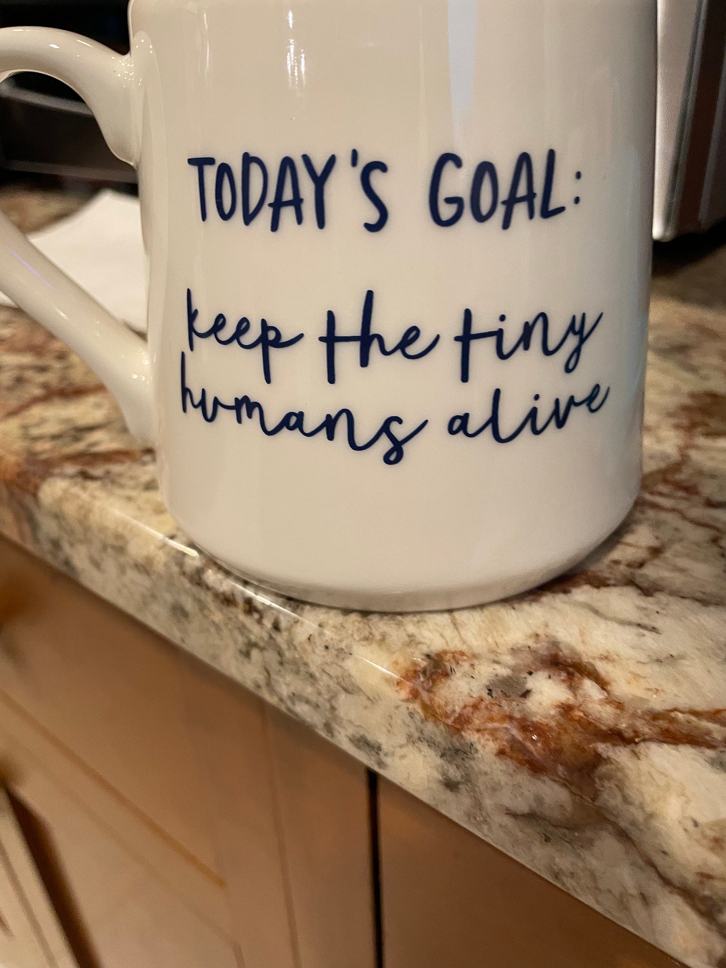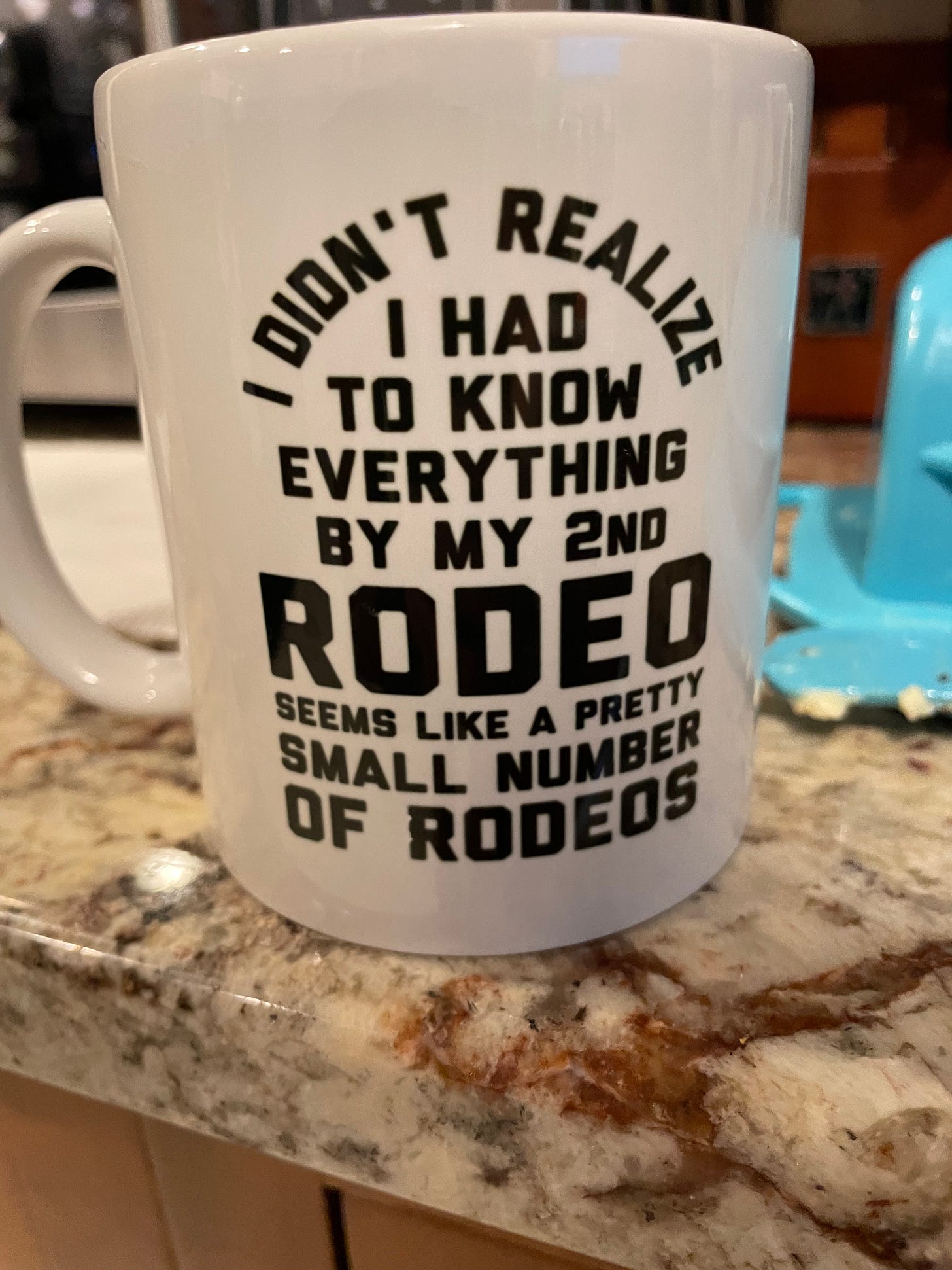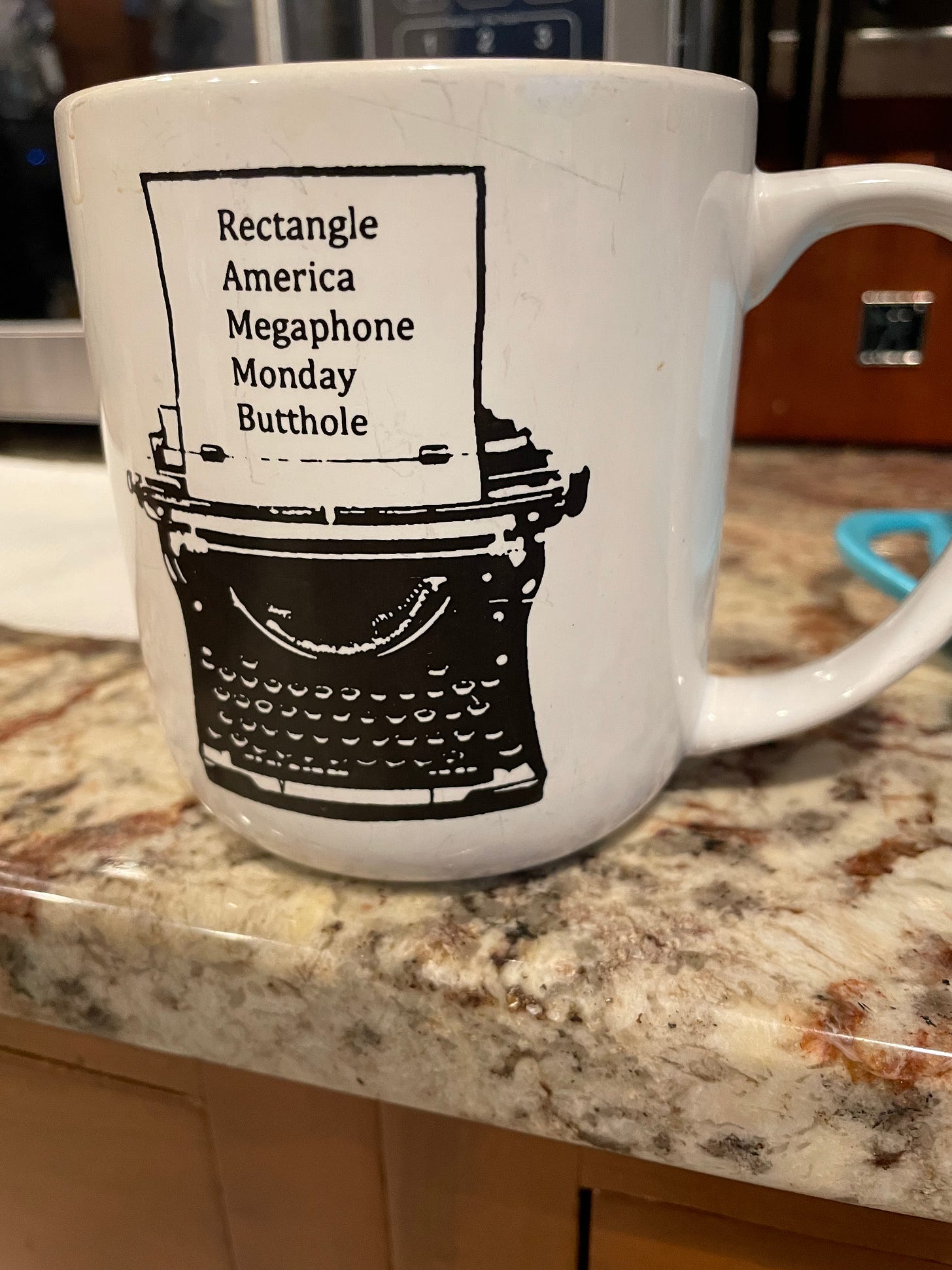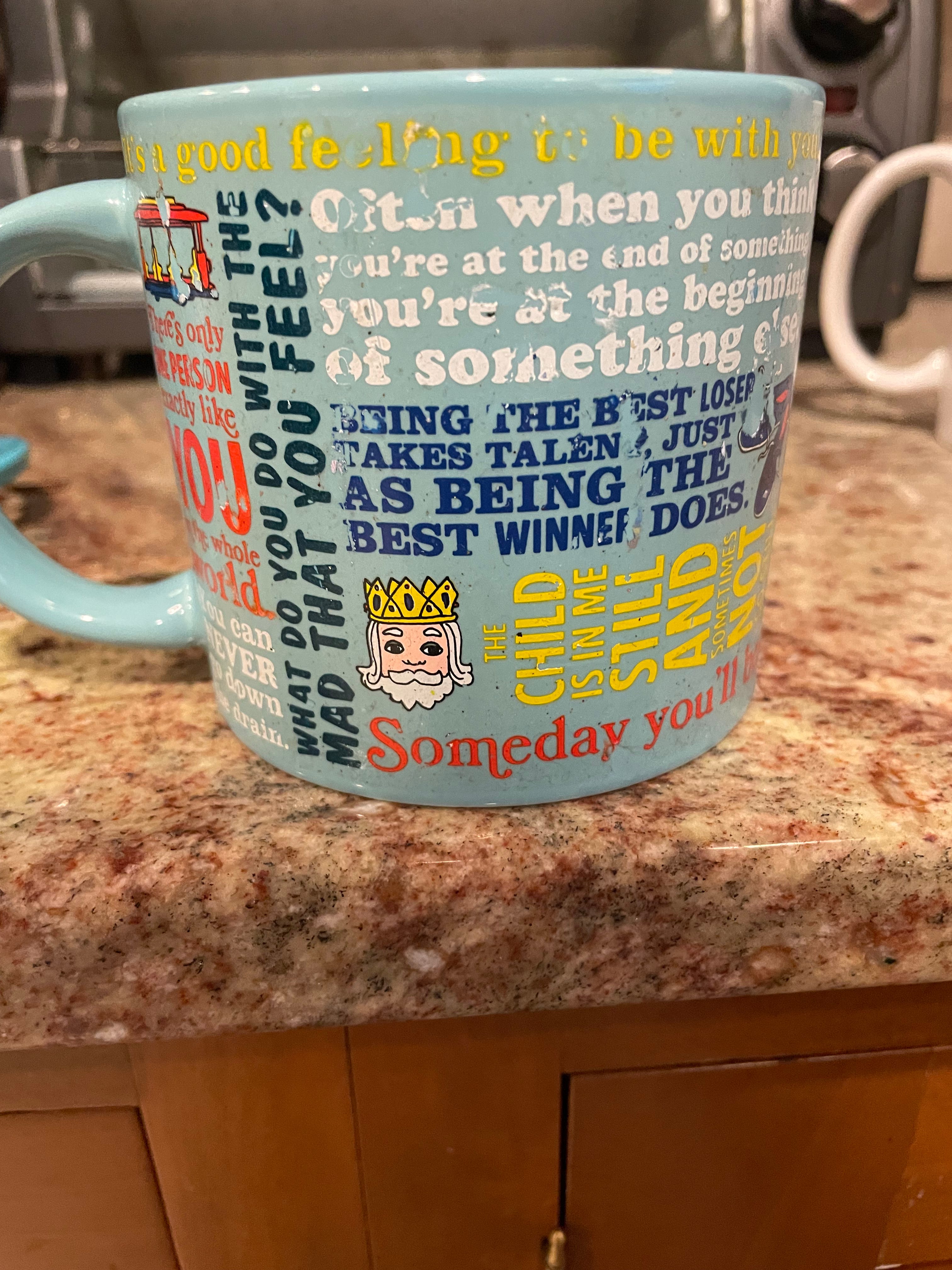 I have quoted this before, but a friend once described my little newsletter as “heartwarming and random in equal measure.” That’s the vibe I’m hoping for, so after pouring all my emotions into my last piece, it’s time for lighter fare. Please follow along as I rank all the mugs we have in our kitchen from least favored to favorite. Why? What is the internet for if not to provide meaningless lists? The rankings will be based on both the quality of the mug and the the pictures/text on the mug. It occurs to me as I begin that this post is a test of my ability to describe the feeling of a mug. Just off the top of my head, you’re probably going to get a lot of “sturdy” “stout” “flimsy” “insubstantial” “fragile” “delicate” and…I think that’s all I have right now. Read on to see if I come up with any others.
