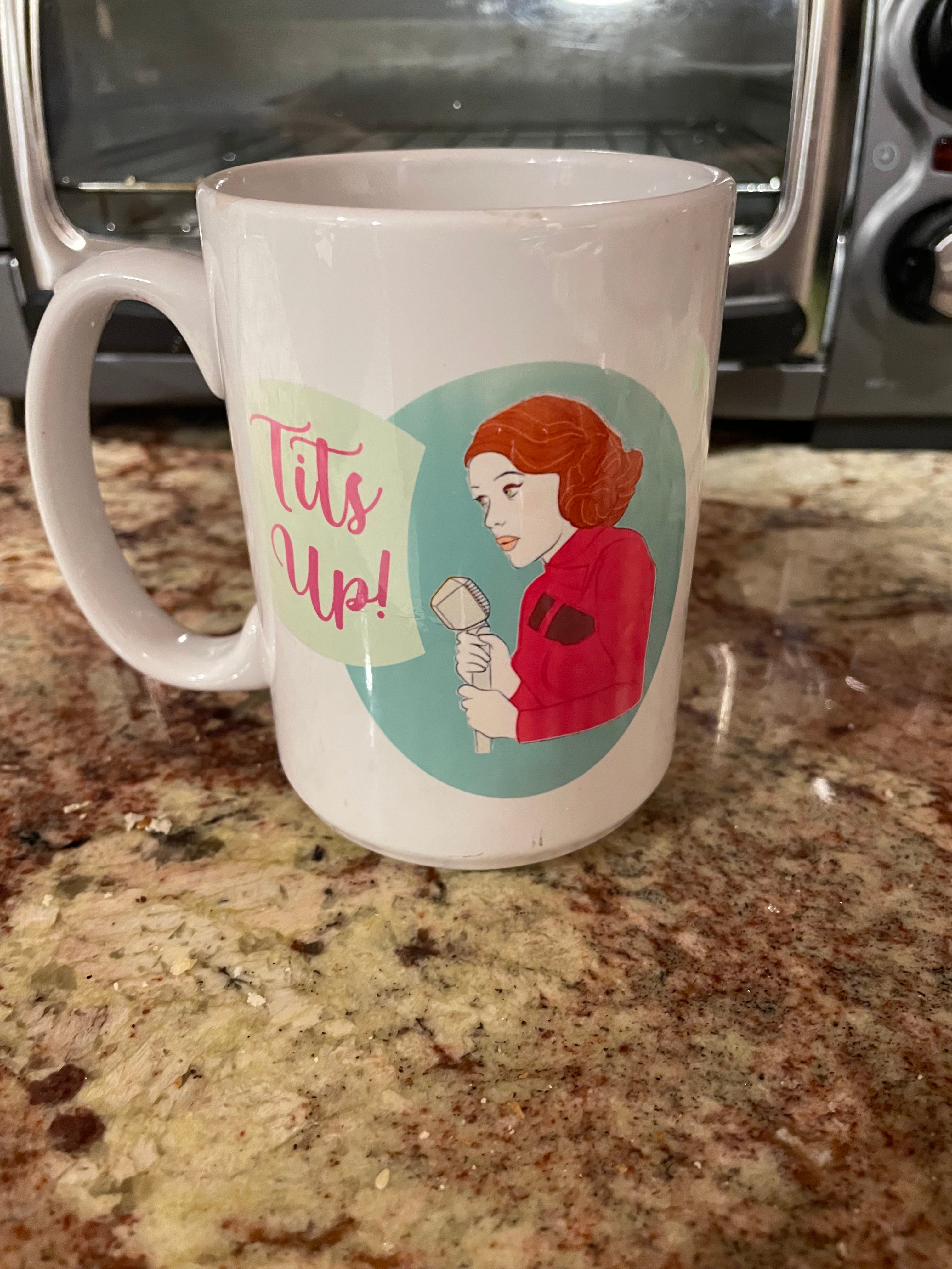 (9) Who doesn’t love Mr. Rogers? I cannot think of many people with a higher approval rating, even after all these years. I think this mug came to us after Caryn donated to a PBS pledge drive — during an emotional moment when they were highlighting how Mr Rogers was an early advocate for inclusion. The message is clearly outstanding, but the design is a bit busy. I don’t know what to focus on. As you can see, it’s also starting to fade a bit, which makes it harder to read. Excellent mug, but the competition is fierce at this stage.