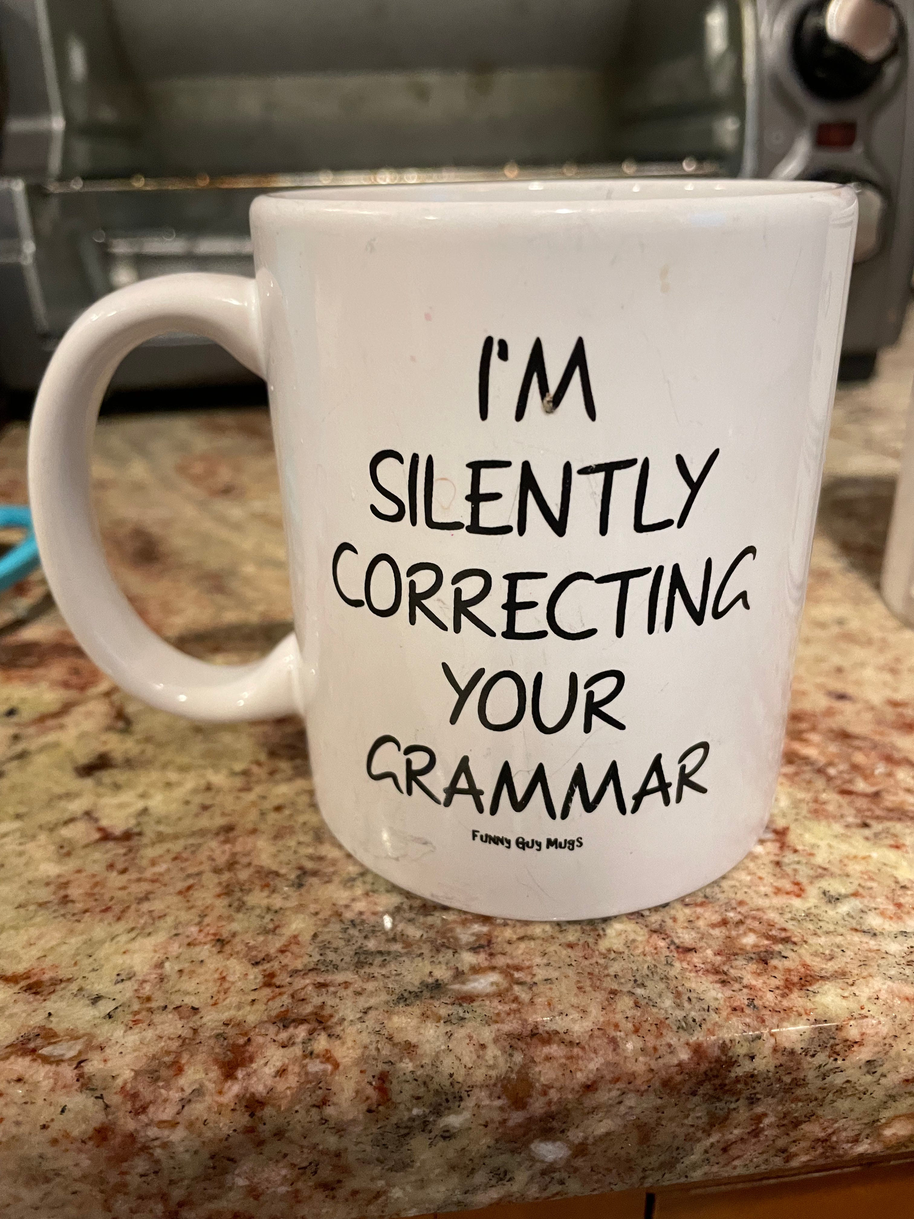 (4) A paradoxical mug. Anyone who reads my writing realizes I am not exactly a stickler for grammatical accuracy. I’m also very particular about certain things, enough so that silently correcting grammar seems on brand. I actually received this mug twice — Caryn gave it to me as a present and then a coworker who liked it replaced it when I broke it. This version has good volume and good feel, combined with the enjoyable text helps it earn this lofty ranking.