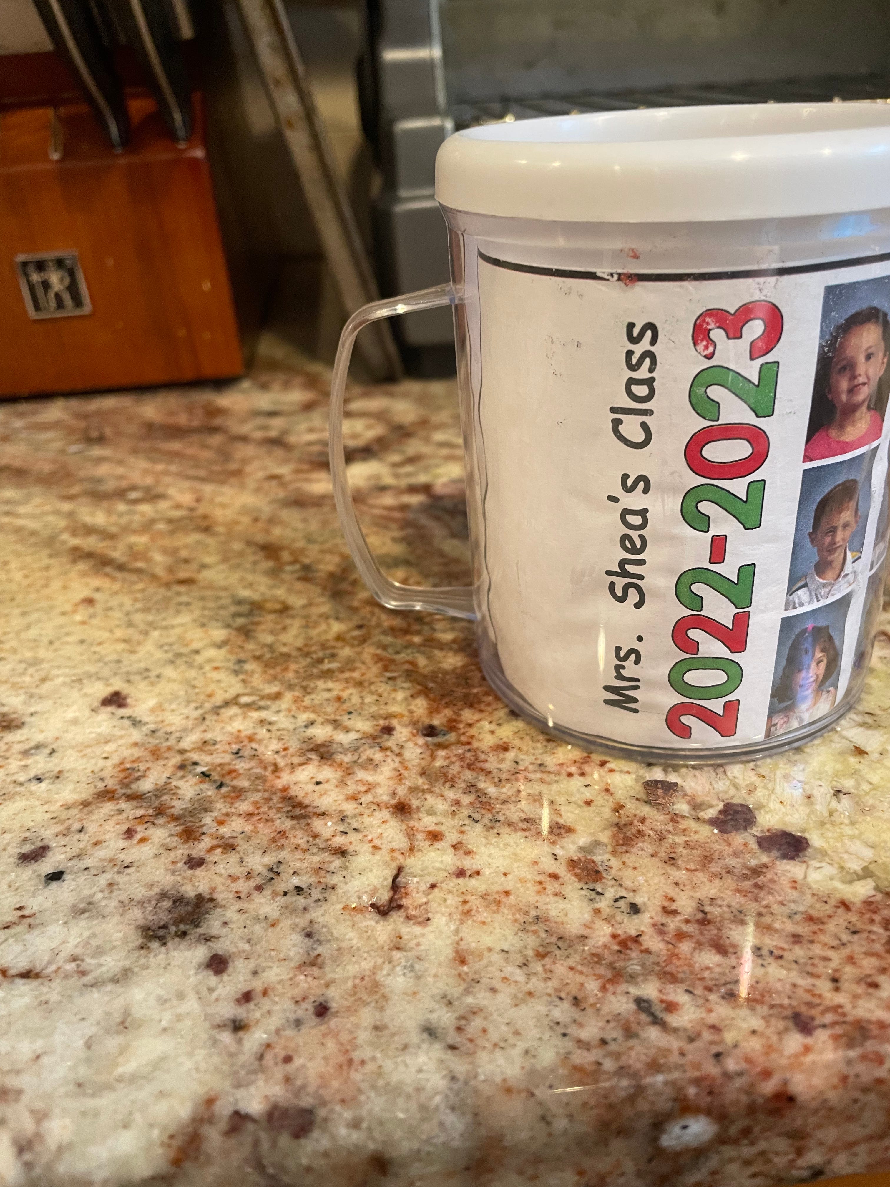 Does not qualify: I’m not sure what to do with this one. It’s a very nice — well, “very” is probably an overstatement — it’s a nice gift we got from Rory at the end of kindergarten. It’s a mug with pictures of all his classmates. The instructions along with it indicate it SHOULD NOT be used as an actual mug. Which means I have no idea what to do with it. It sits in the cabinet, unused and neglected, sadly collecting dust. I guess I should probably put it in a box in the basement or something, but that requires me to get my shit together and organize and archive things. It’s sentimental, but not really a mug, therefore I don’t believe it deserves an official ranking.