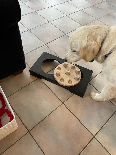 Lately I’ve been using the toy pictured above for this purpose. Caryn found this one, and it’s supposed to be a little puzzle for her to solve. You hide treats under the little pegs, and she has to figure out which ones have treats under them, free the treat, and then eat it. At least that’s the idea. It generally keeps her occupied for a little bit, hopefully long enough for the boys to eat.